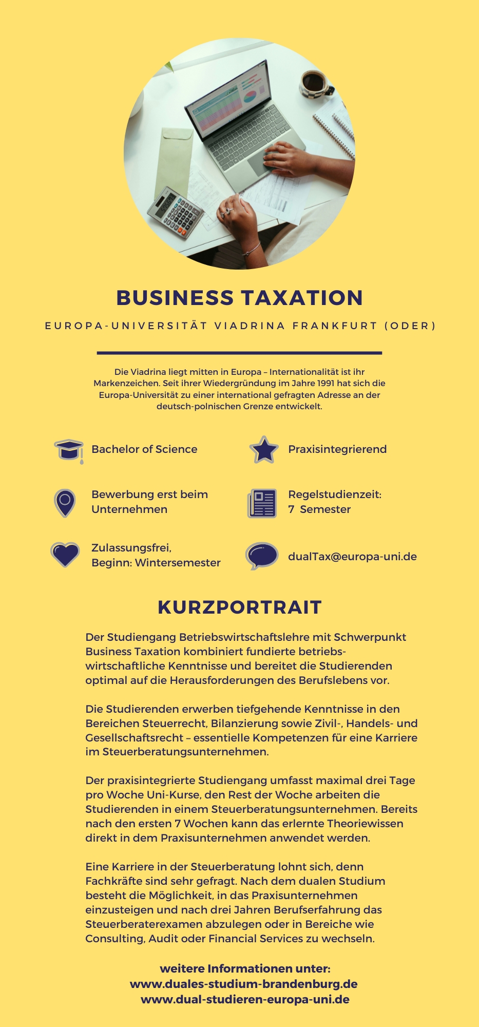 Dann ist das duale Bachelorstudium Betriebswirtschaftslehre mit Schwerpunkt Business Taxation (oder kurz: Business Taxation) an der Viadrina genau das Richtige für Sie!