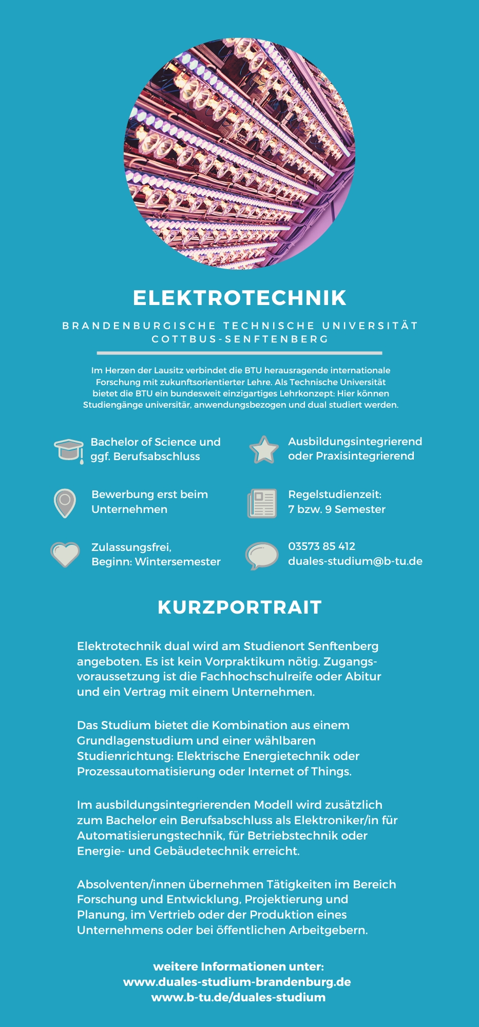Sie fragen sich, wie aus Sonnenstrahlung elektrische Energie wird? Wollen wissen, wie ein modernes Smartphone funktioniert? Warum moderne Autos künftig selbstständig, wie von Geisterhand gesteuert, durch den Stadtverkehr fahren können? In solchen oder ähnlichen Bereichen möchten Sie zukünftig arbeiten? Dann ist das duale Studium der Elektrotechnik genau das richtige für Sie.